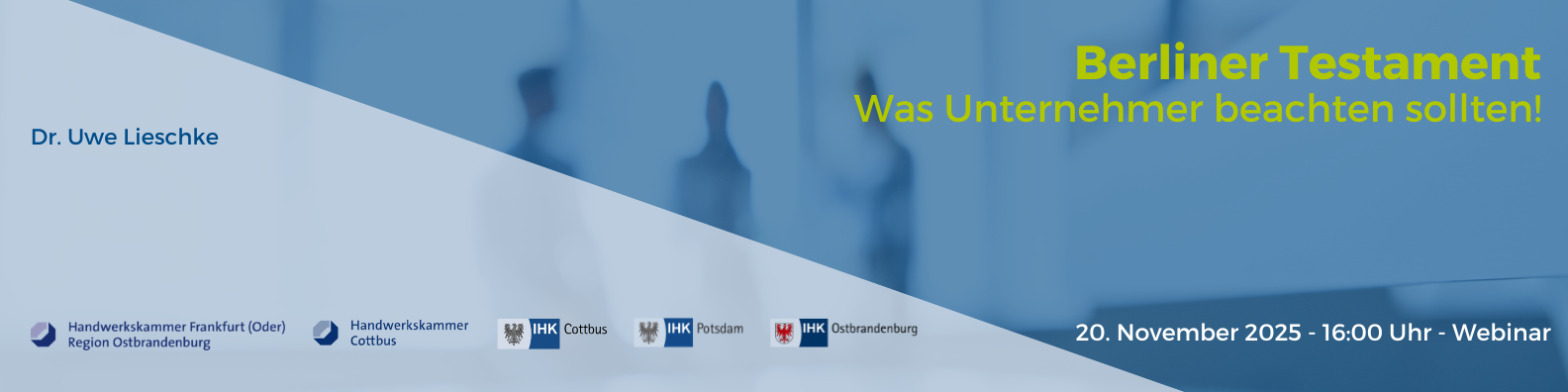 Dr. Uwe Lieschke, Fachanwalt für Erbrecht, stellt im Webinar praxisnahe Beispiele vor und zeigt Handlungsoptionen auf. Nutzen Sie die Gelegenheit, Ihre individuellen Fragen zu stellen und sich auf die rechtlichen und steuerlichen Herausforderungen des Berliner Testaments vorzubereiten, um die Zukunft Ihres Unternehmens zu sichern.