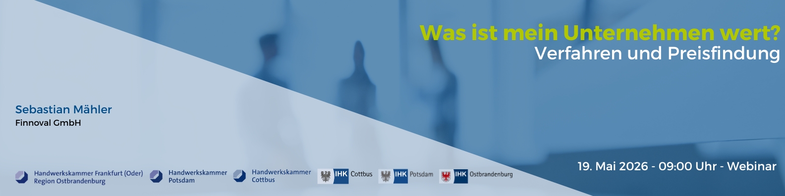 Wie viel ist Ihr Unternehmen wirklich wert? In unserem kostenlosen Webinar erfahren Sie, welche Verfahren zur Unternehmensbewertung eingesetzt werden und wie sich ein realistischer Kaufpreis ermitteln lässt. Als Referent agiert Herr Sebastian Mähler, Unternehmensberater bei der Finnoval GmbH. Er gibt Ihnen praxisnahe Einblicke in gängige Bewertungsmethoden und zeigt, welche Faktoren den Unternehmenswert beeinflussen.