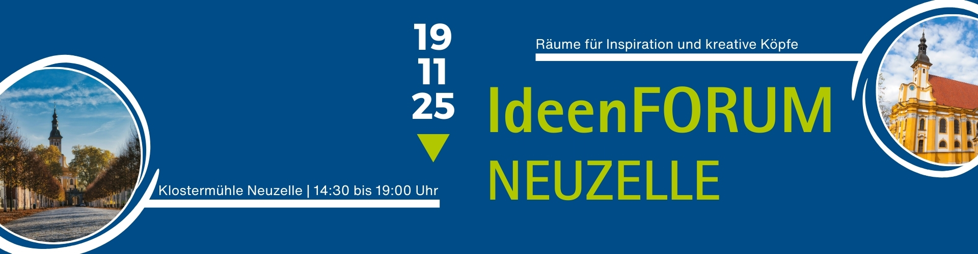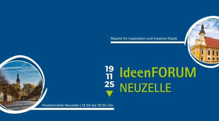 Erleben Sie beim IdeenForum Neuzelle am 19. November 2025, wie regionale Ideen und Unternehmergeist den Ortskern neu beleben können. In Rundgängen, Impulsen & Erfolgsstorys und im offenen IdeenForum haben Sie die Chance, Ihr eigenes Konzept vorzustellen, direktes Feedback von einer Expertenjury zu erhalten und wertvolle Kontakte zu knüpfen. Nutzen Sie die Gelegenheit, die Klostermühle Neuzelle als zukünftigen Standort kennenzulernen und gemeinsam Perspektiven für ein lebendiges Neuzelle zu entwickeln.